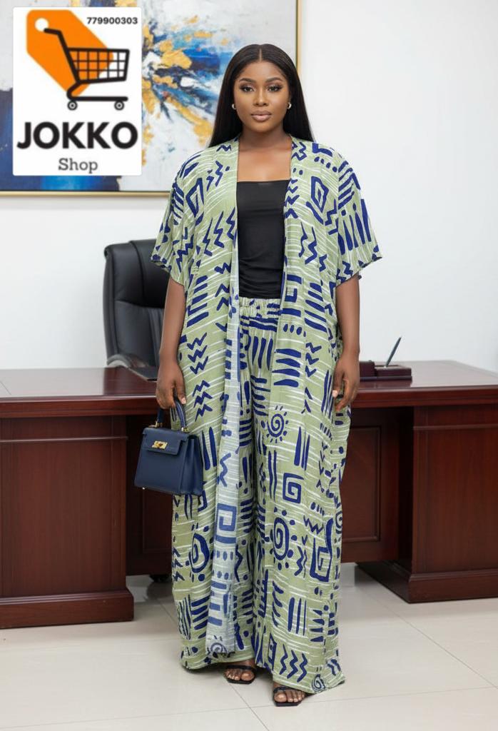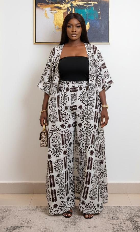 Cet ensemble trois pièces de style africain, composé d’un long kimono fluide, d’un pantalon large assorti